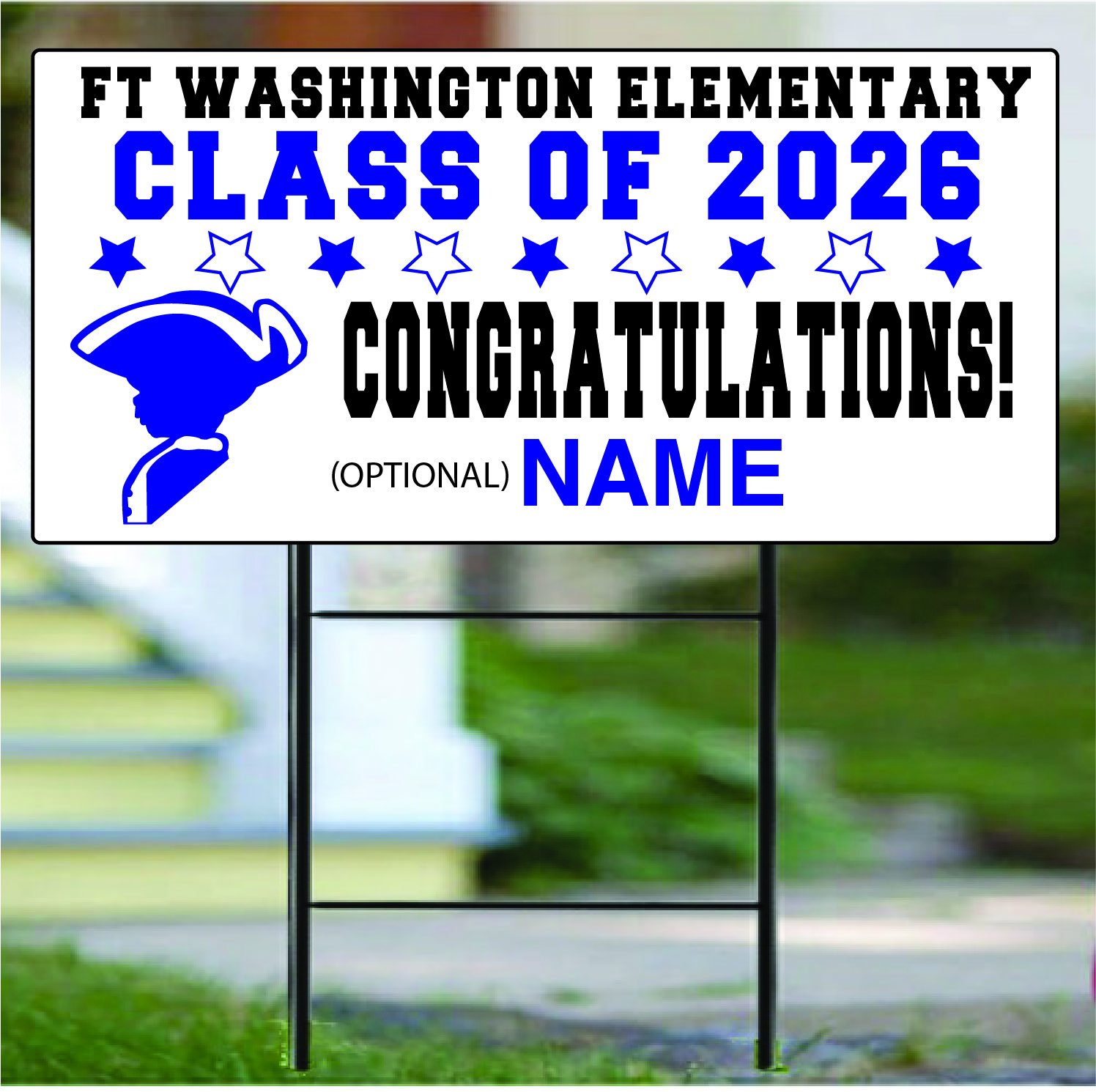 12" x 24" Corrugated Yard sign printed on two sides with the FWES Class of 26 design. Includes metal yard stake. Optional personalization available on one or two sides.